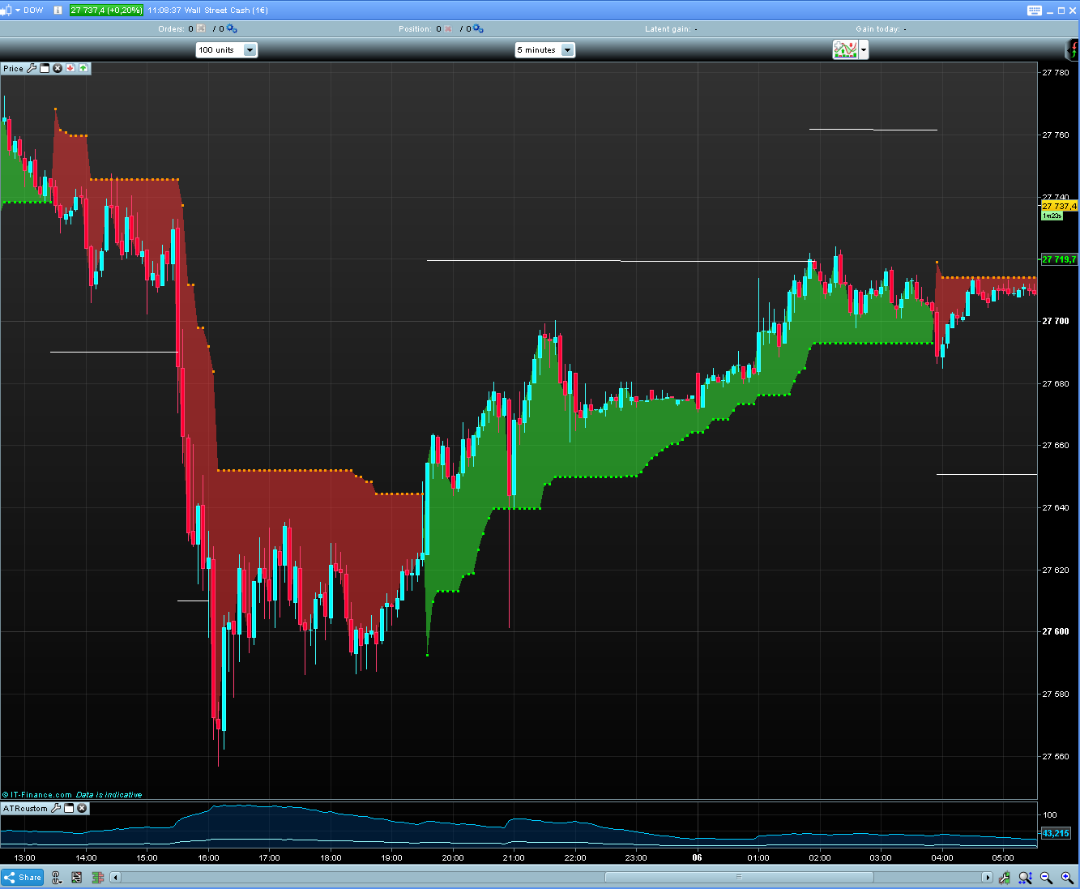 I would like to explore the possibility to visually view profit target using a simple SuperTrend indicator on ProRealtime. In the chart when price changes the trend (orange dots go green for instance), I would like a horizontal line drawn at for example 5atr above in case trend is up. when price touches this line I would like another line to be drawn 5atr above and so on until the trend changes. When a new line is drawn I would like the previous line to stop being drawn. I have attached a sample where I have manually drawn white segments the way I would like them to show up. The lower chart in aqua is ATRcustom simply ATR(14)*5.