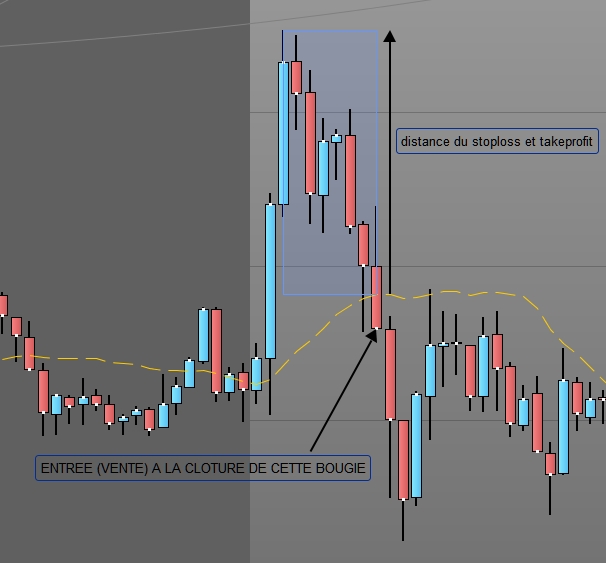une entrée en position à la clôture de la bougie qui croise une moyenne mobile (relativement simple) mais surtout a coder le TP et SL correspondant au point de croisement du cours et de la moyenne mobile et du plus haut (ou plus bas selon achat ou vente)