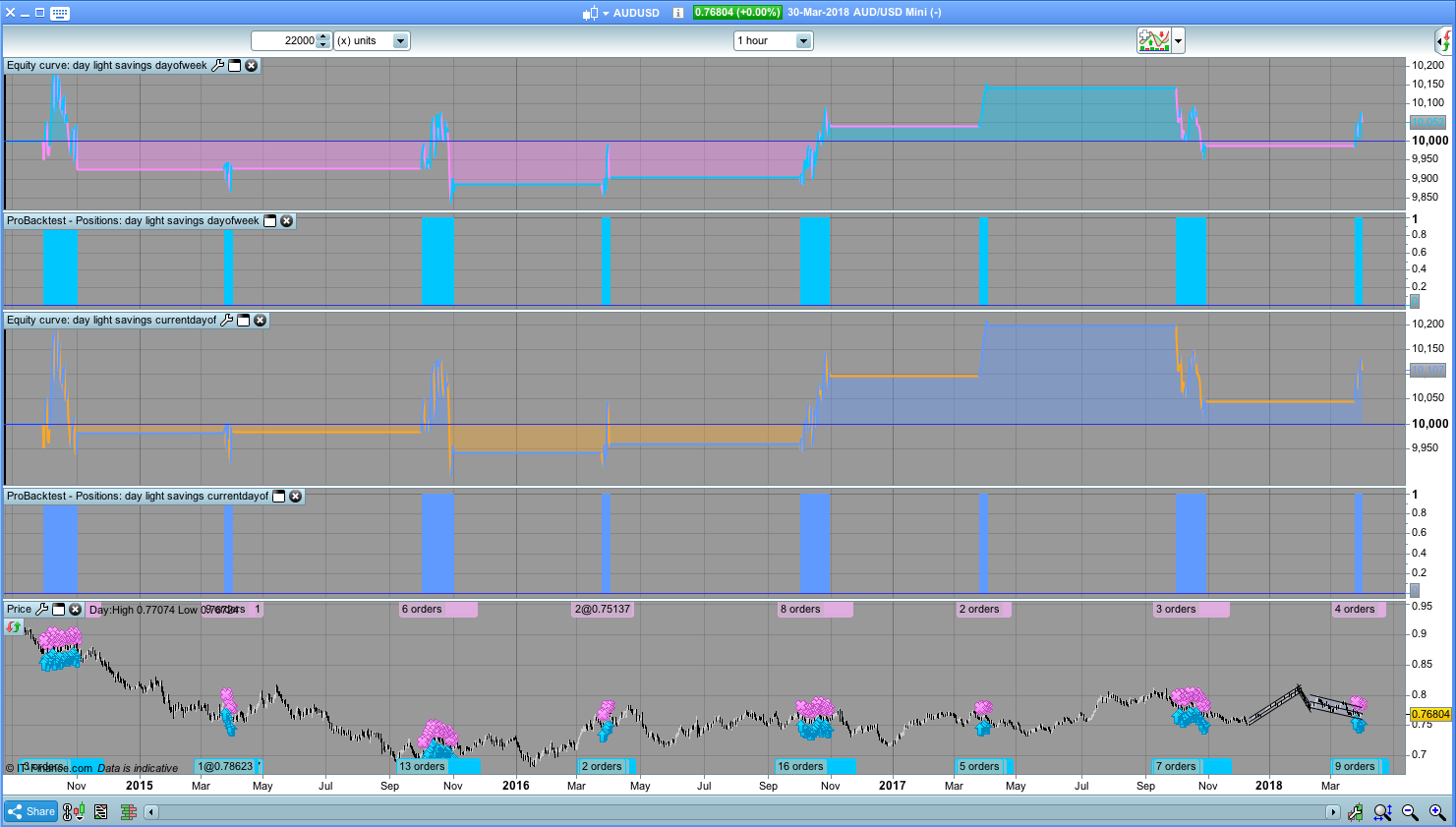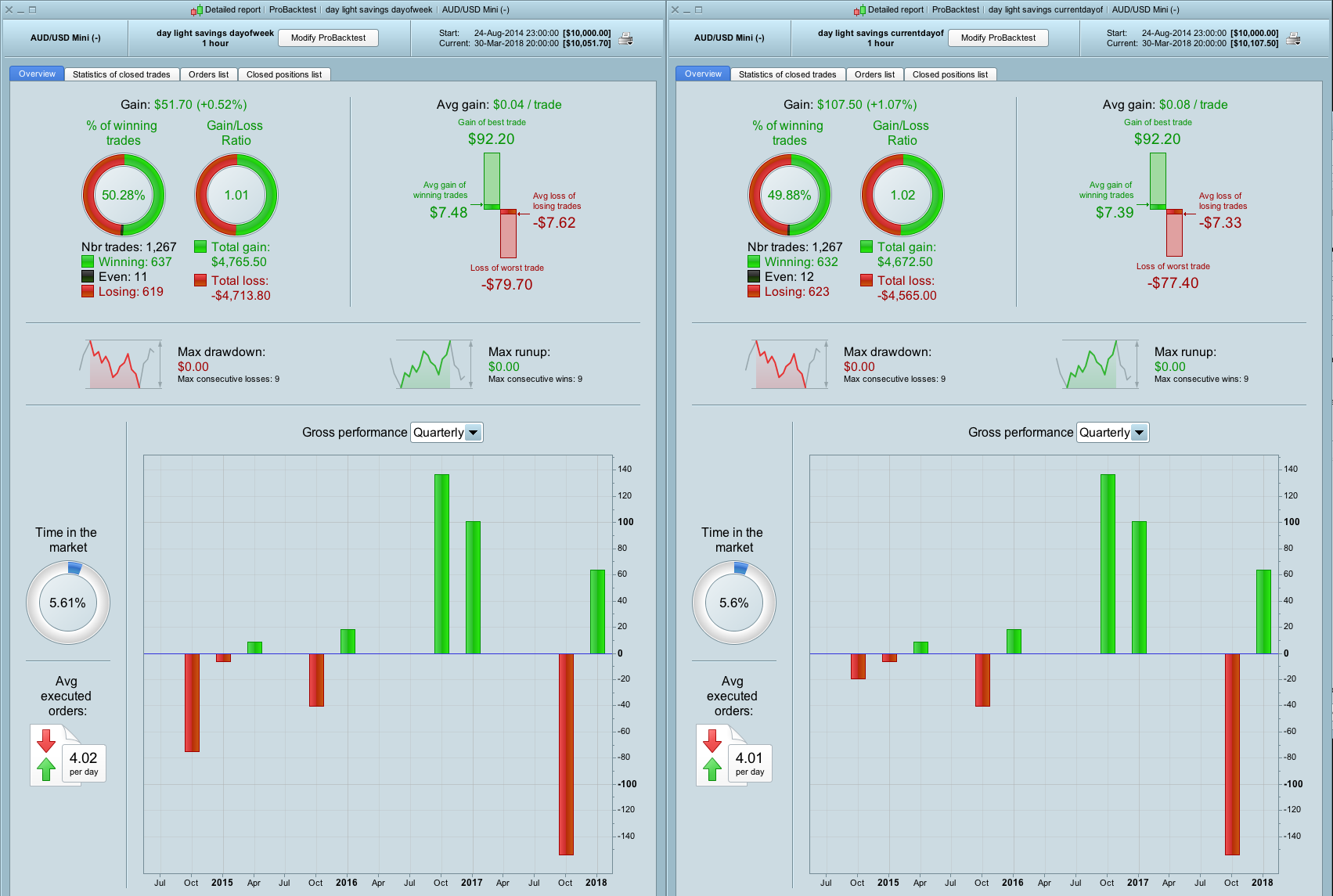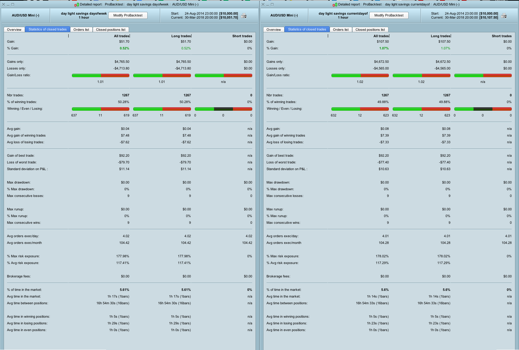 I also remembered it’s possible to use currentdayofweek which should produce the same results and it does for most parts. However when I run a backtest for AUDUSD h1 22K for some reason a comparison of the 2 reports shows there’s difference in results. I compare the list of trades in  a spreadsheet (here as a web page and as spreadsheet) and all the trades are the same they match but the statistics are not the same?