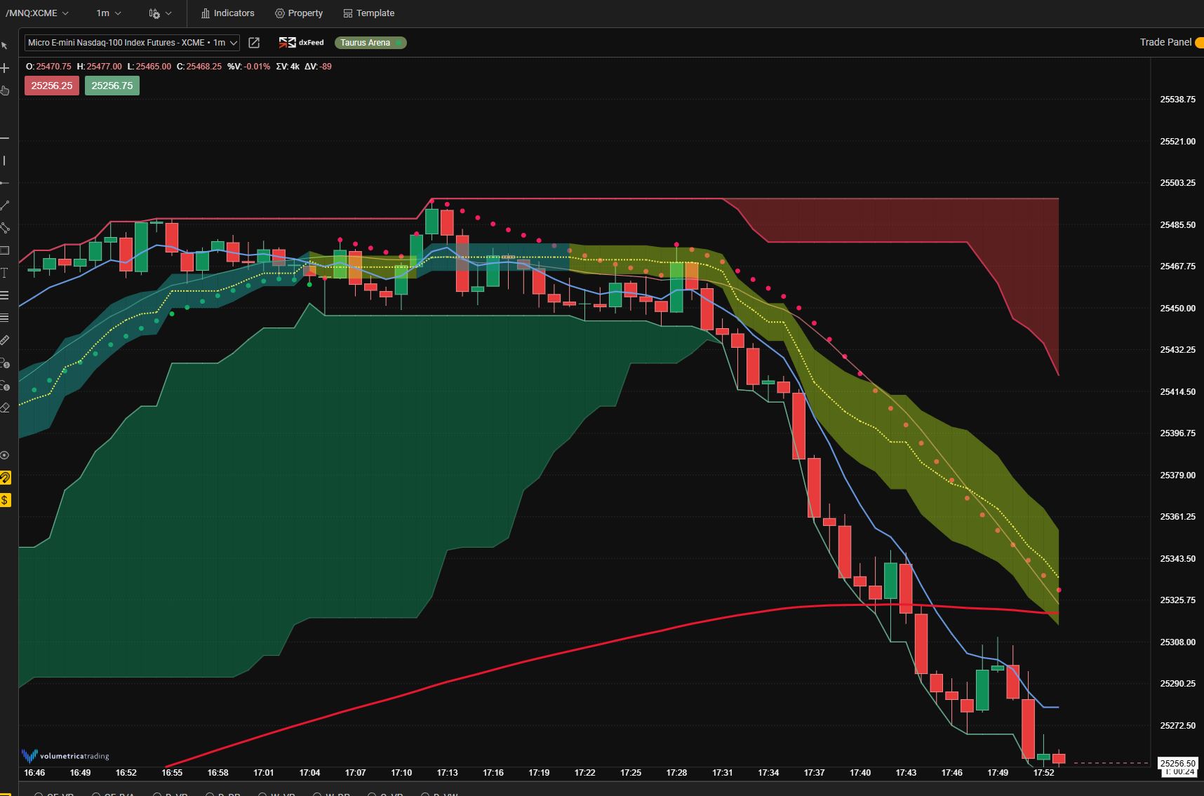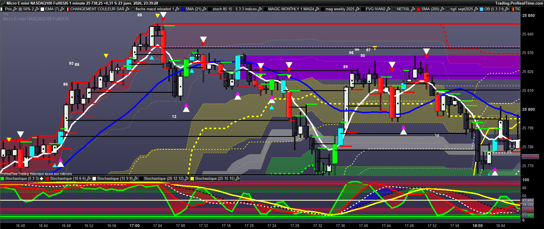 Cet indicateur mixe probablement un nuage Ichimoku associé aux classiques EMA, SAR, et peut-être un canal de Keltner ?