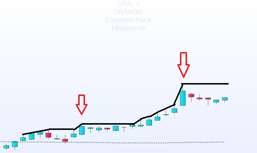La tendance est haussière lorsque le cours est supérieur à la moyenne mobile simple à 200 périodes. Le début de cette phase de congestion est détectée lorsque le haut de la séance est strictement inférieur au haut de la séance précédente. Cette phase est stoppée lorsque le prix de clôture est au dessus de la résistance. Ce repérage de résistance est stoppé lorsque les prix clôturent sous la moyenne mobile simple à 200 périodes. Pour illustrer mes propos et à partir du logiciel Paint j’ai tracé en noir ce que cela devrait donné visuellement sur le titre Orange en journalier.