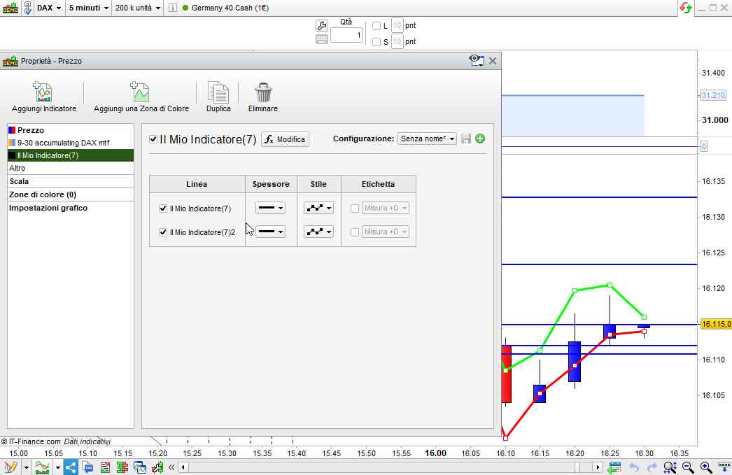 Forse hai già risolto, in ogni caso ti allego una foto che ti mostra come cambiare il tipo di tratto ed il suo spessore, tramite le proprietà dell’indicatore.