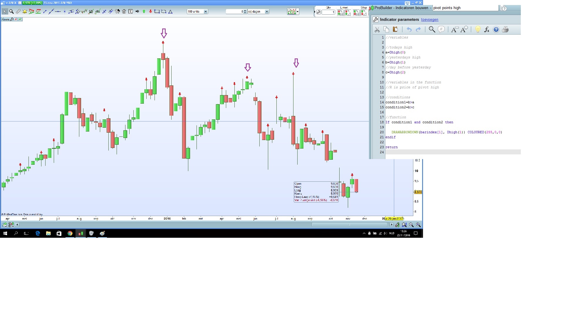 Hello, I tried to obtain the second order pivot points today, I want to mark them with another arrow in a different color. I ran into the following problem, I need a function which compares the different results rendered in the first function and picks out the highest one of a series. Until now I haven’t been able to come up with something thats works, are there any tips or could someone show me the way? I tried different functions found in the clossary on this website but nothing worked 🙁 I’ve included a picture of the code, the code of my previous question which is working fine and the selected data I want to extract from the first code and I want to represent on the graph. yours sincerely Bert