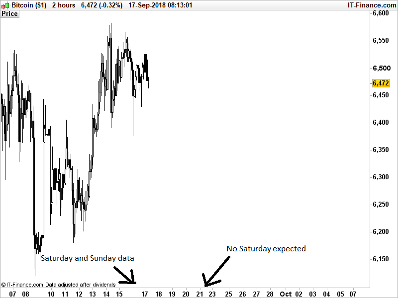 It is remarkable that the chart doesn’t “expect” there to be a next bar during the weekend on the time axis. For example if it’s 13:00 on Saturday, the chart displays correctly all the past bars, but it expects the next bar to be on Monday according to the time axis. However, if the intraday bar is finished, the next Saturday bar inserts correctly. On the attached image this becomes clear as there was data past weekend, but next Saturday there’s no data expected.