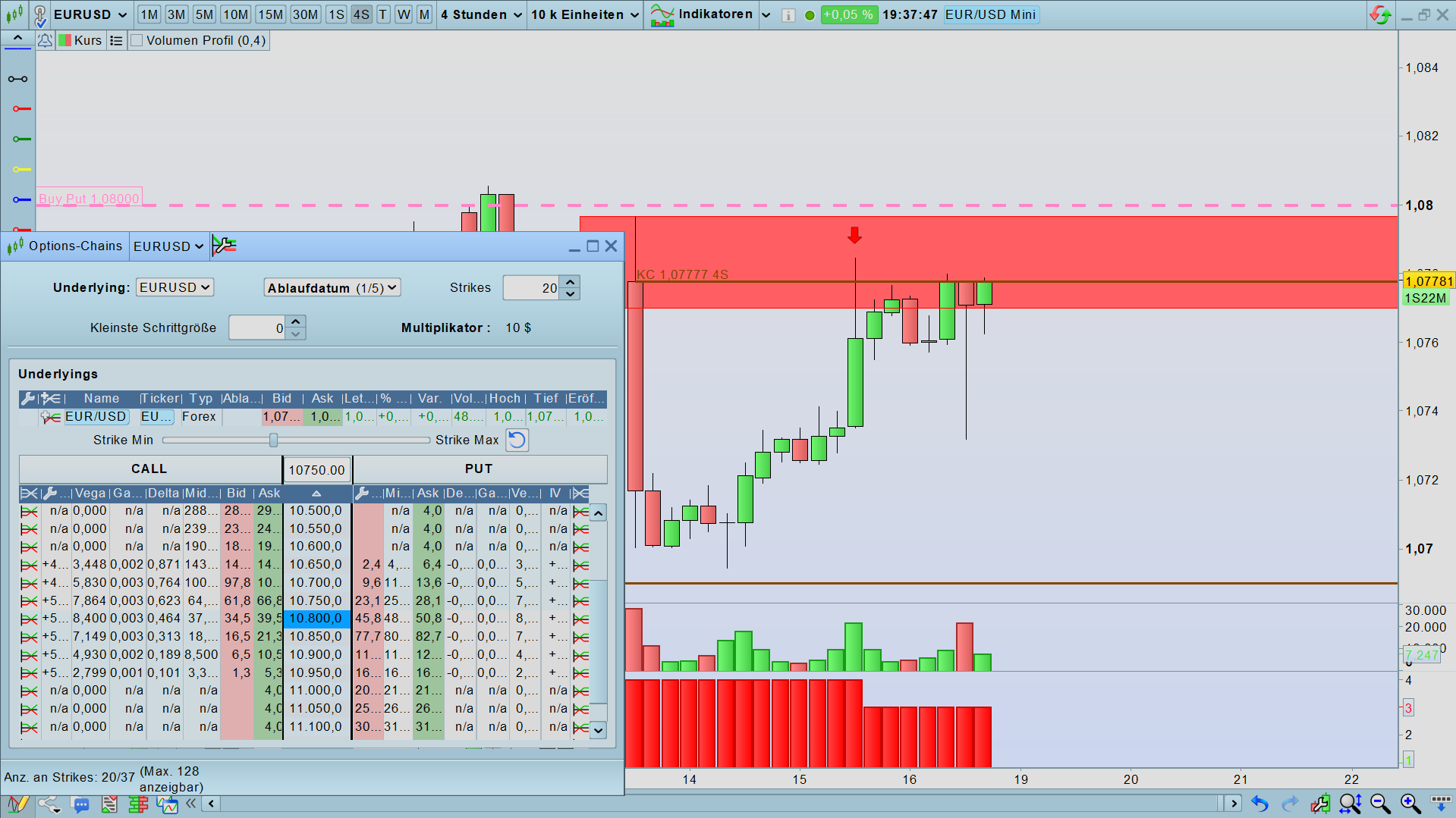 For example, on this chart, when the price of EUR/USD reaches the Level of this red candle, it opens an option (buy put) first available above the price with an expiration date next available after 20 days.