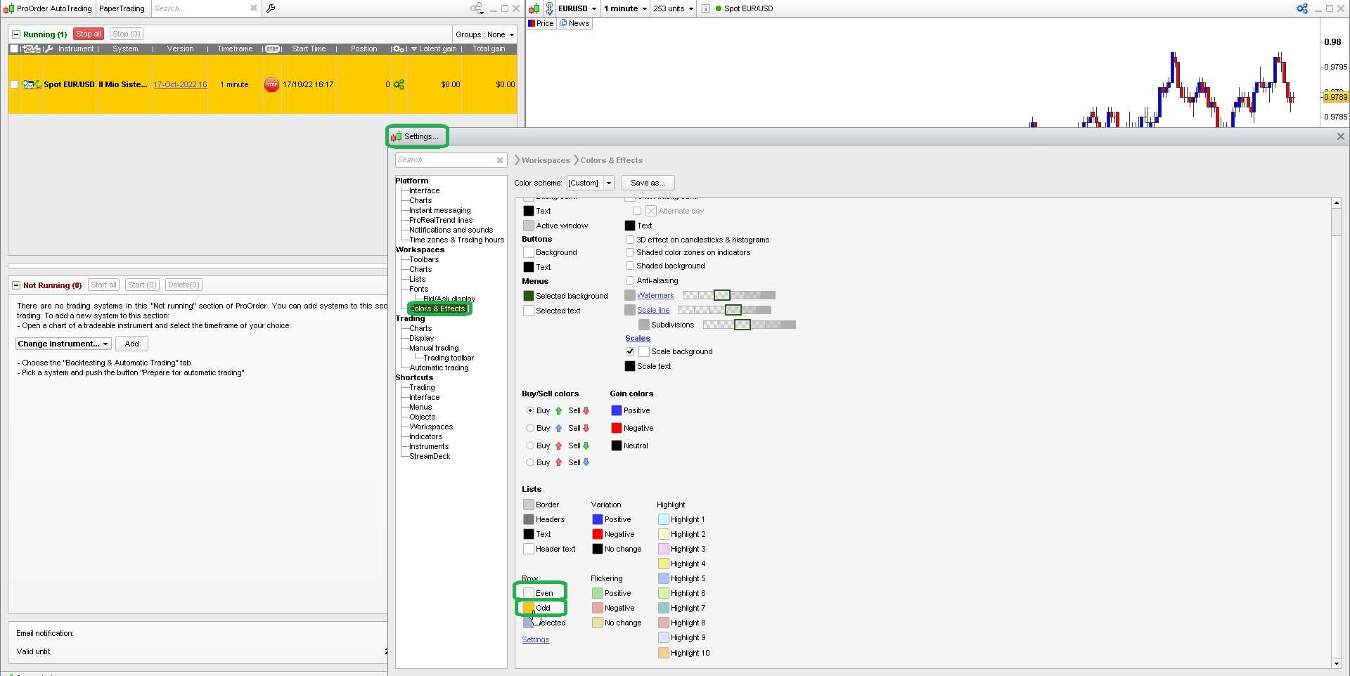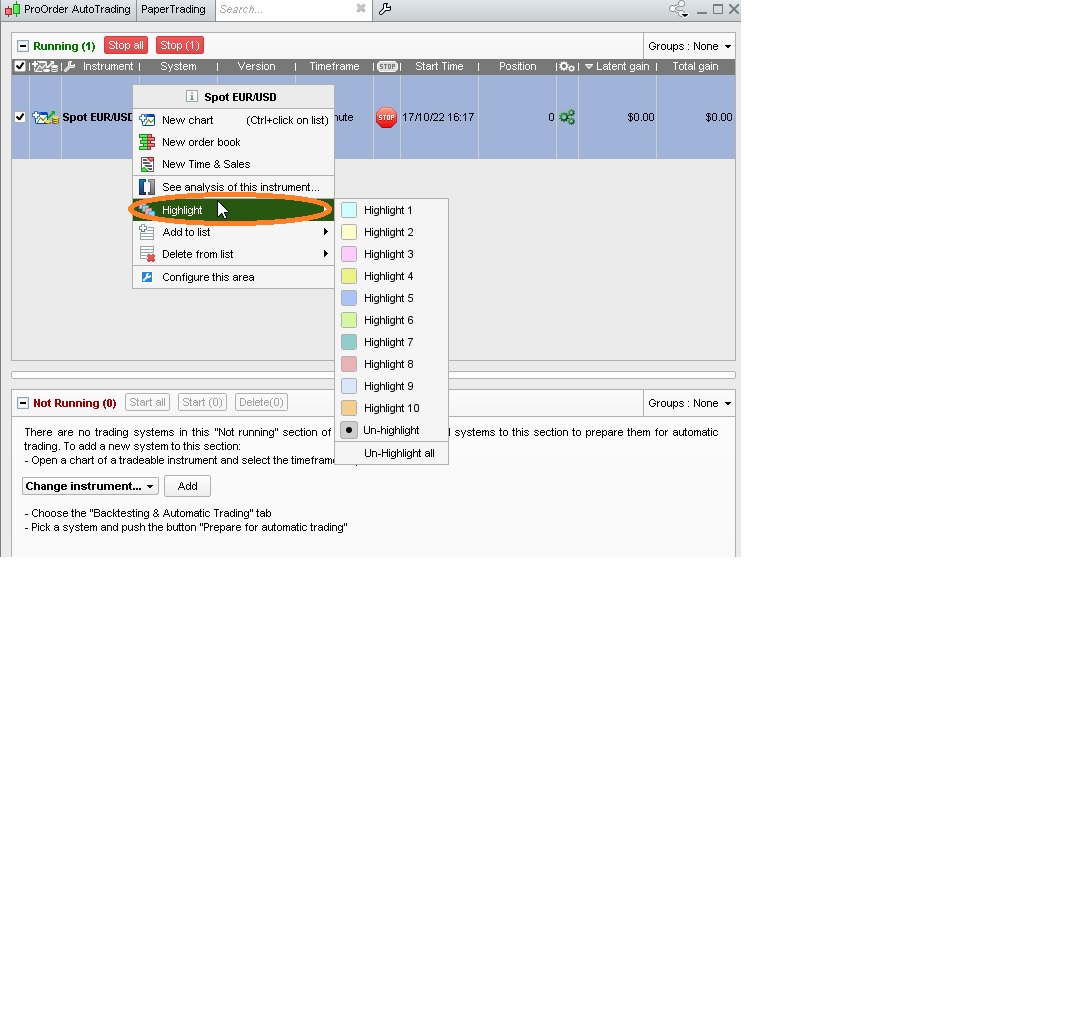 - x1 – sit your mouse on a line of the autotrading panel and click the right button, then choose a colour from the HIGHLIGHT menu