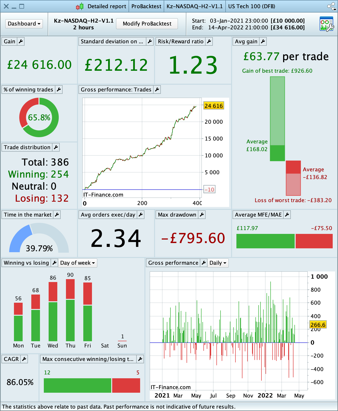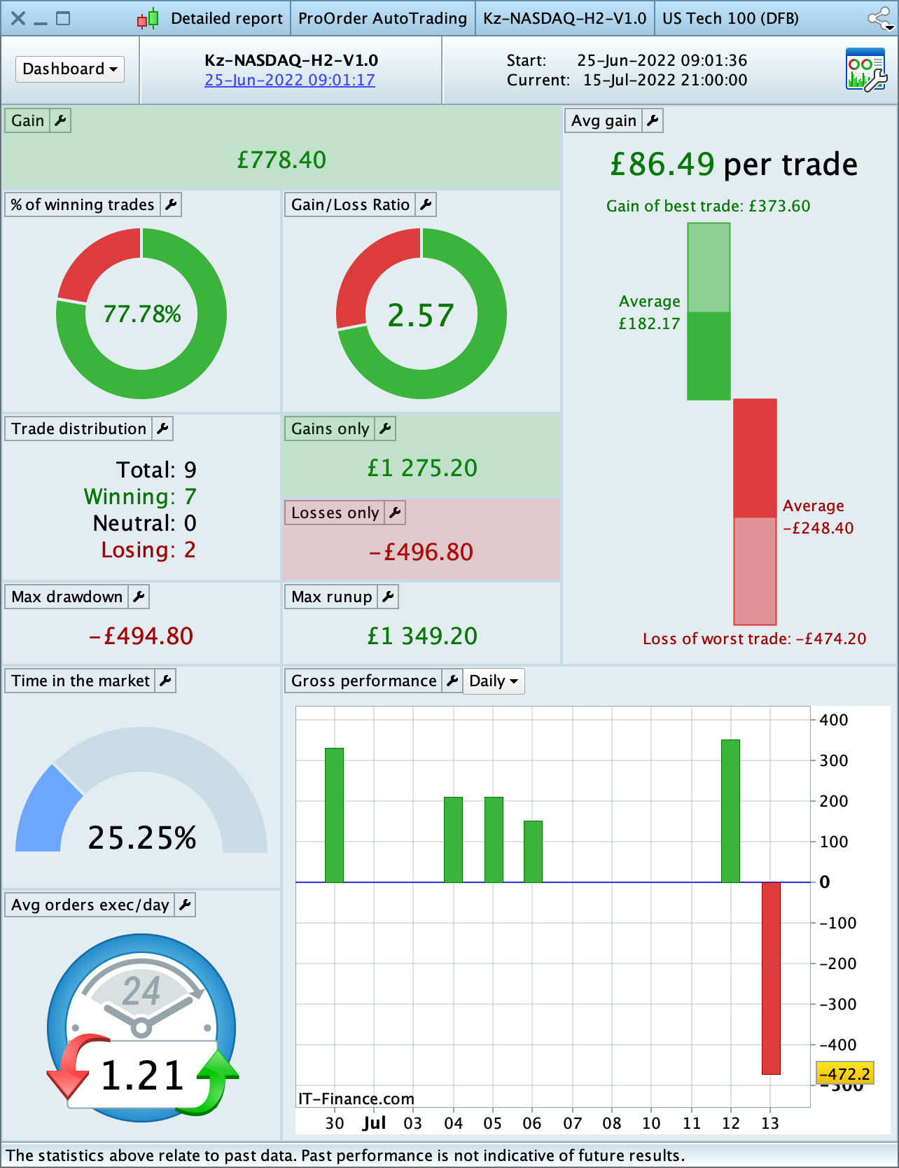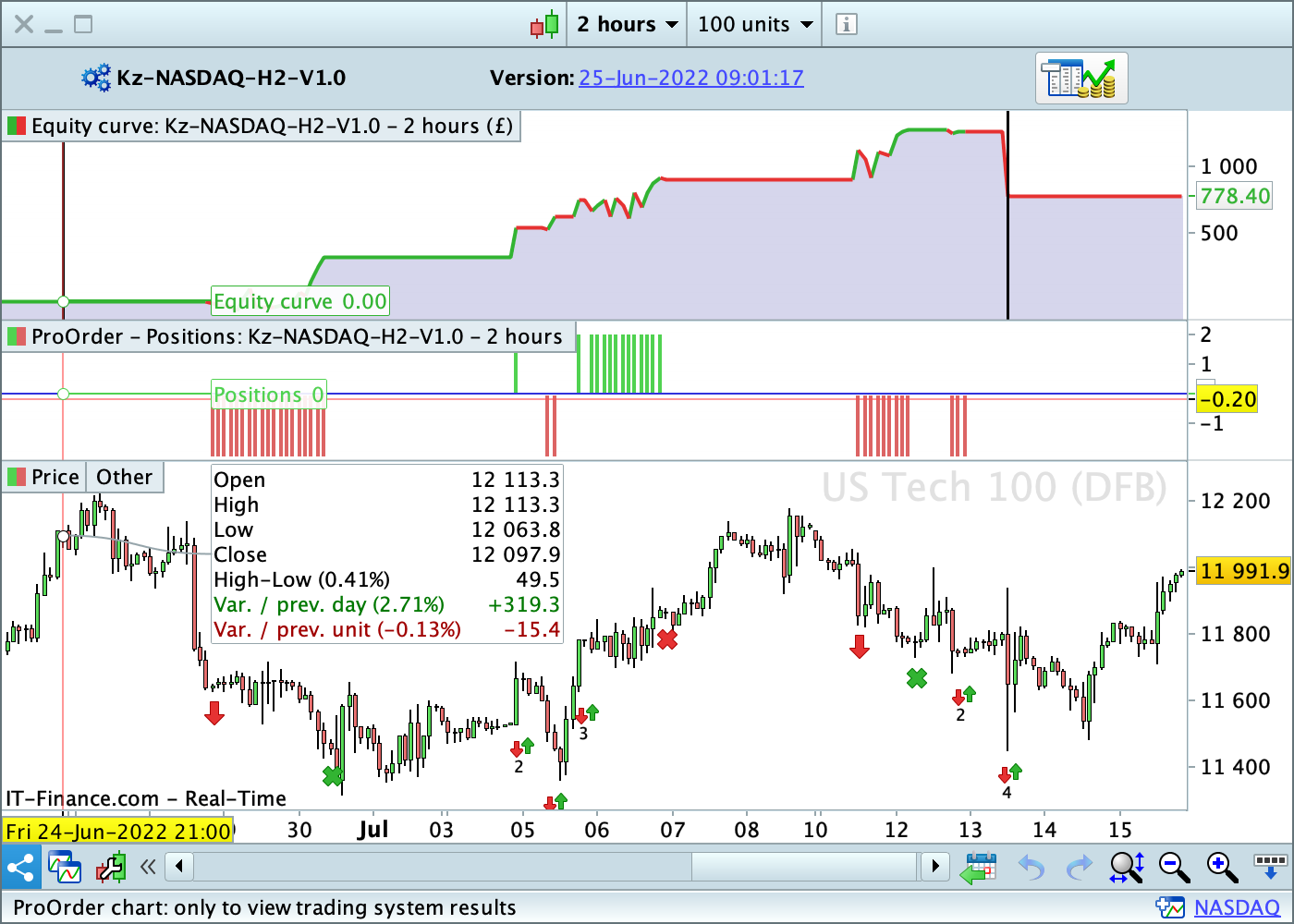 Hi, I created this thread to post regular updates on the performance of the strategy that I’ve developed and now offering on MarketPlace – Kz NASDAQ 2H. The bot is configured as follows: once nbContracts = 1 once stoplo = 130 once flatOverWeekend = 0 once endOfPlayHH = 20 The backtest for the configuration specified above is: Live results The bot was launched on the 25th of June 2022, Saturday. As of 16th July, we have 3 weeks of performance: