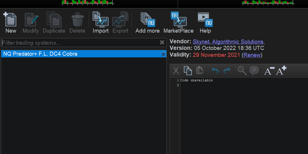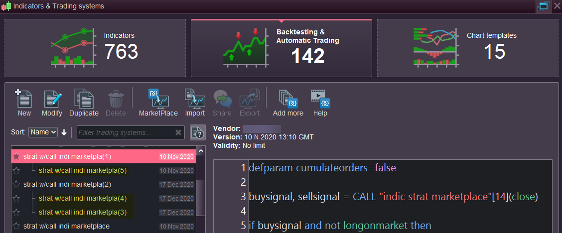 2/ To modify the code of a strategy, for example to change a contract size parameter, the user automatically creates a copy (see attached image). These copies are linked to the original code and displayed as a “treeview” (I have highlighted them in yellow in the picture). These copies are however unlinked from the original code, so that the original code is always available in the event of errors. Note that these copies will always keep the same version number as the original code from which they are derived, so they won’t be overwritten by a later update of the original code (which will see its version number modified with its new date). I hope I’ve made myself clear 🙂