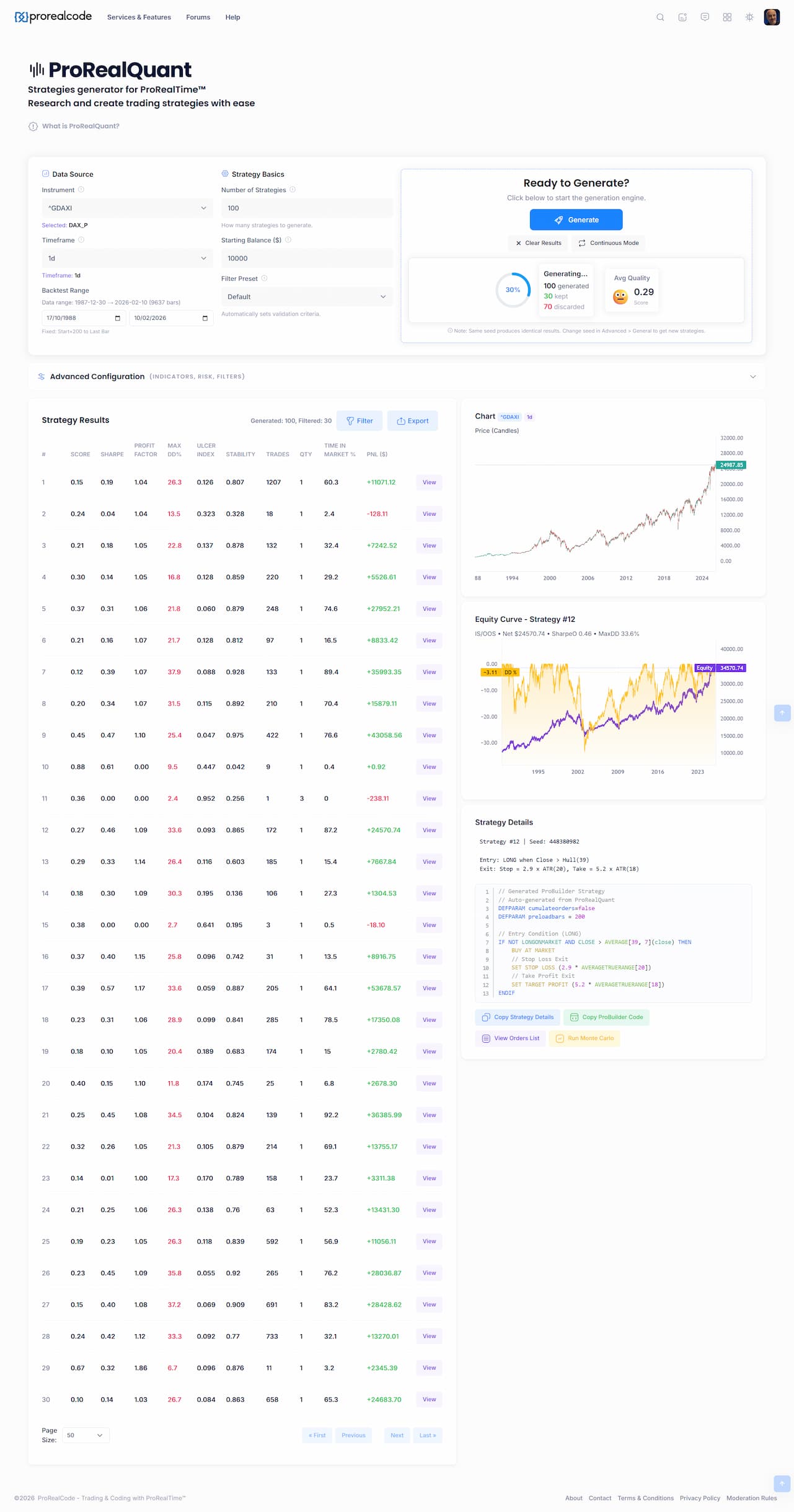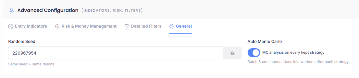 You can now enable automatic Monte Carlo analysis directly during strategy generation. The option is in Advanced Configuration, General tab, check the “Auto Monte Carlo” box and you’re set.