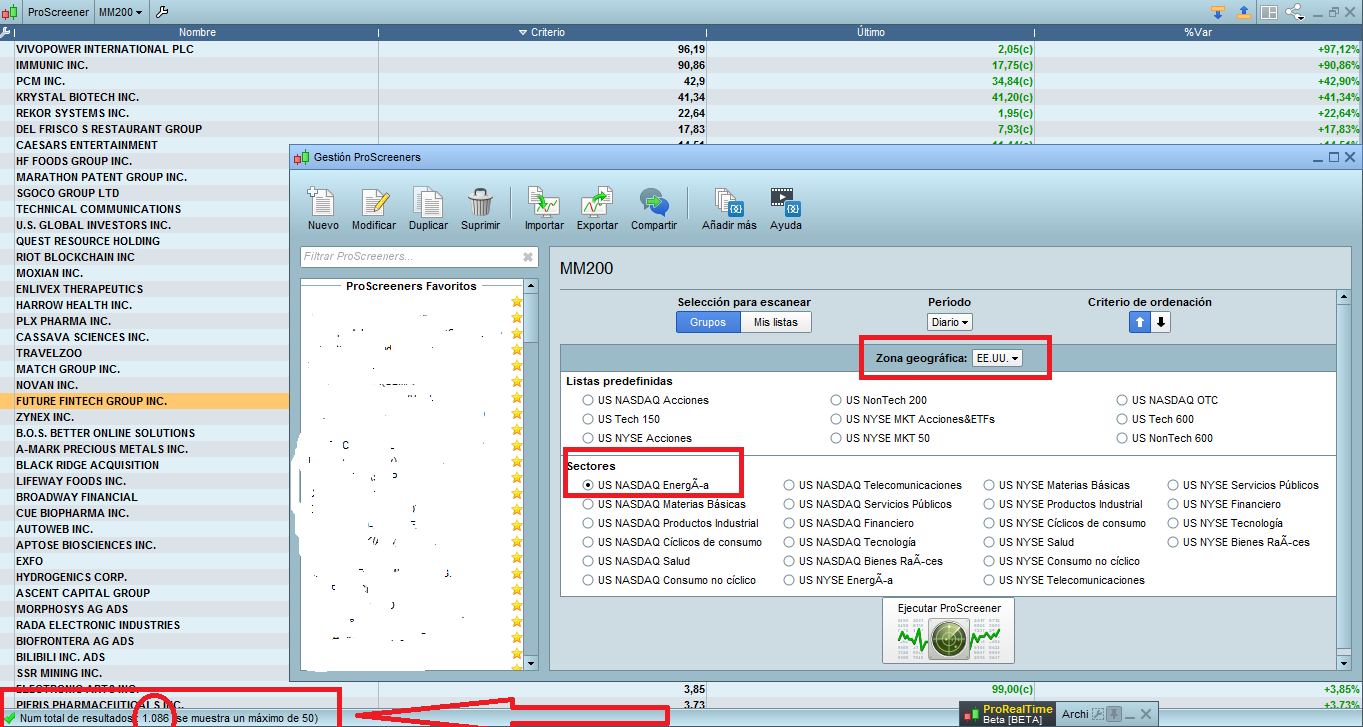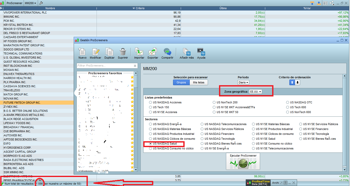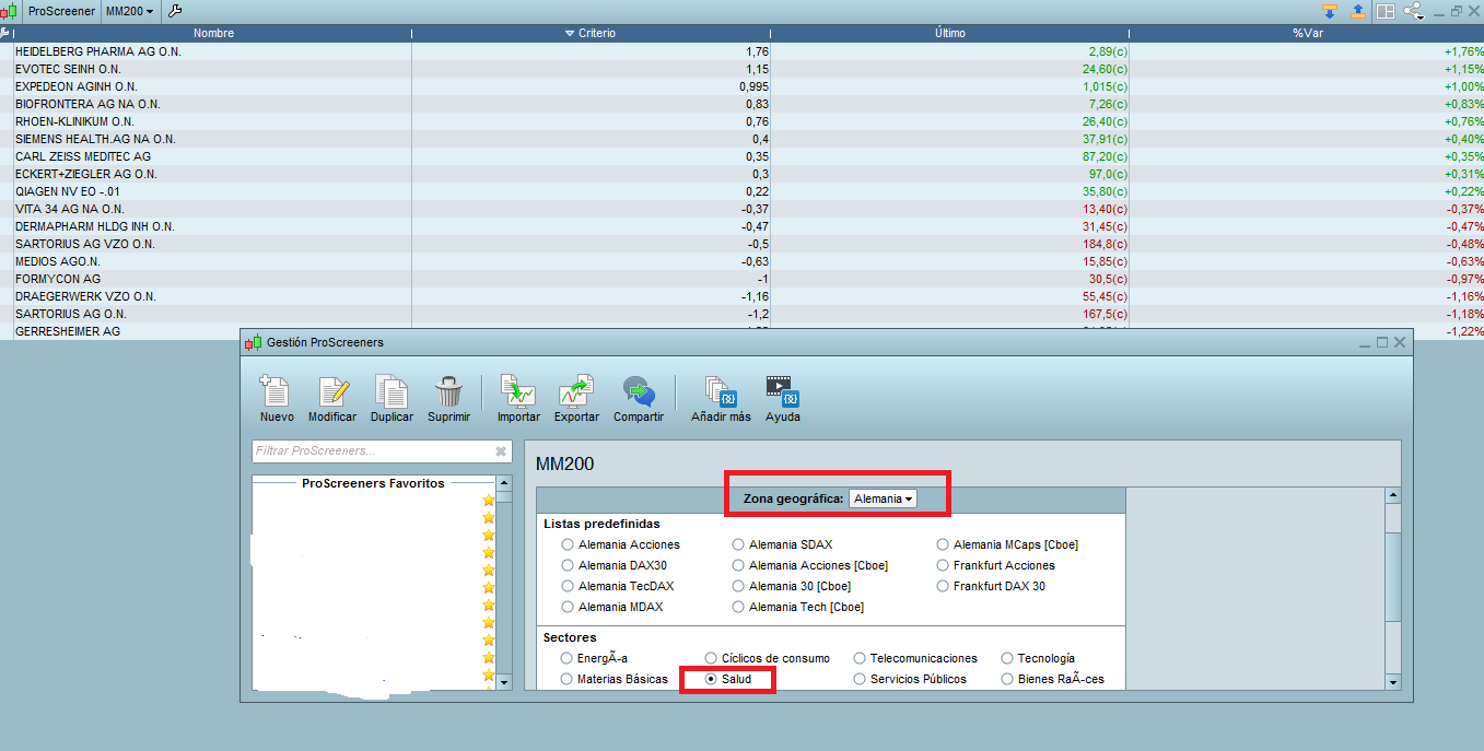 In contrast in geographical area: Spain, Germany … yes it works. I have tested with several screeners and it always fails in the US in sectors. I have put an example of a screener with the price above the 200 SMA. Check it with any screener of yours. The attached images show that the screener works in Germany. In the US, 1086 shares always come out in the HEALTH sector and the ENERGY sector …