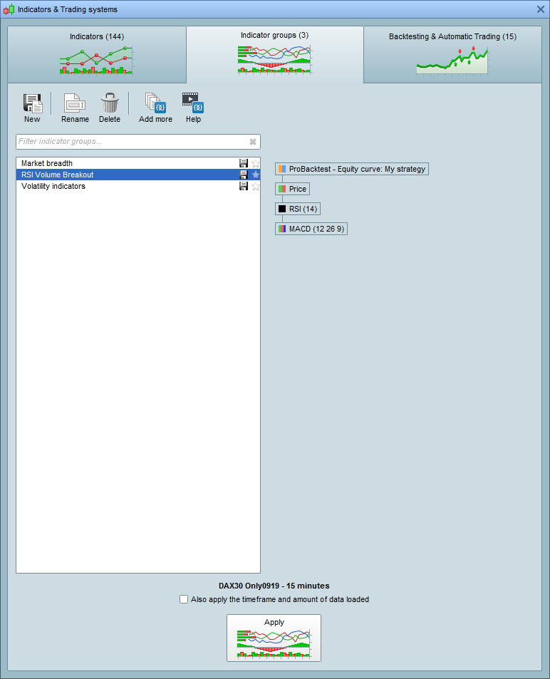 You can now save complete groups of indicators in #ProRealTime v11 which can be applied on any chart, independently from any template.09/23/2019 at 11:31 AM #10823209/23/2019 at 11:49 AM #10824009/23/2019 at 12:16 PM #108247Does anyone have any idea when will IG brokers get version 11?