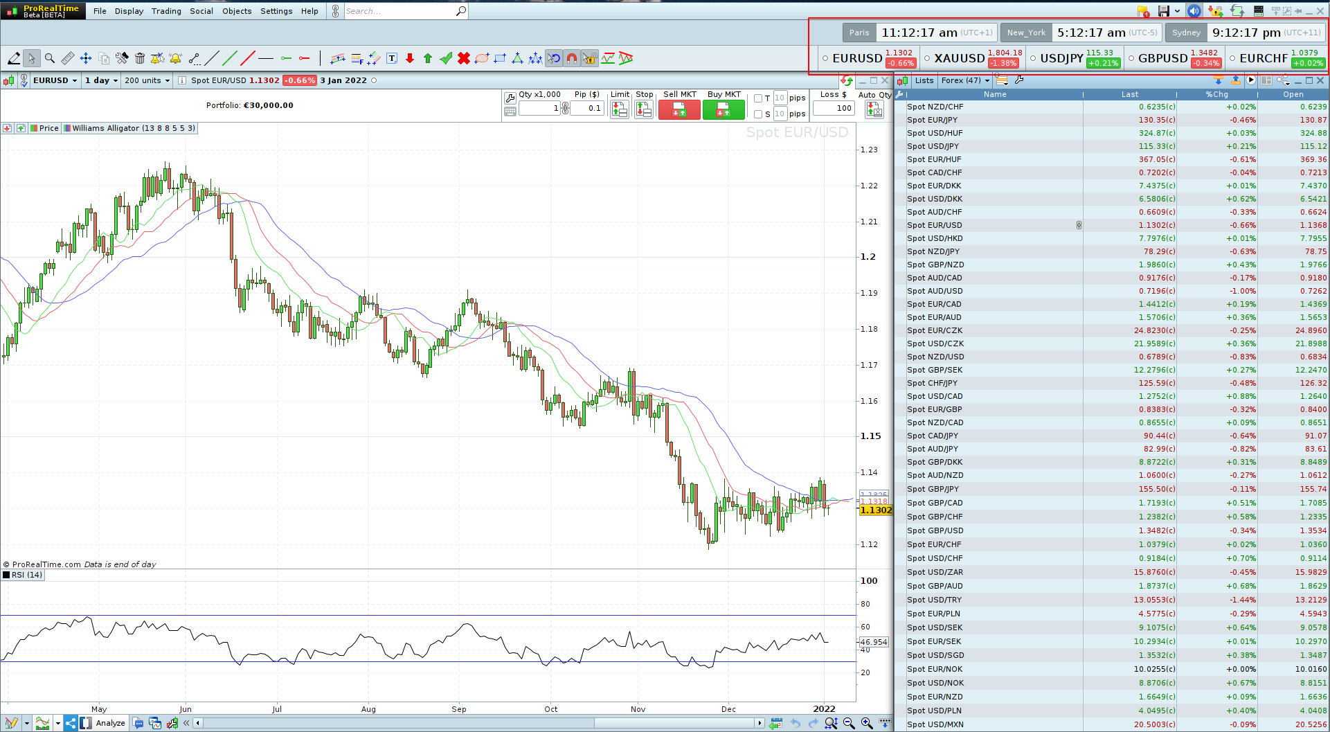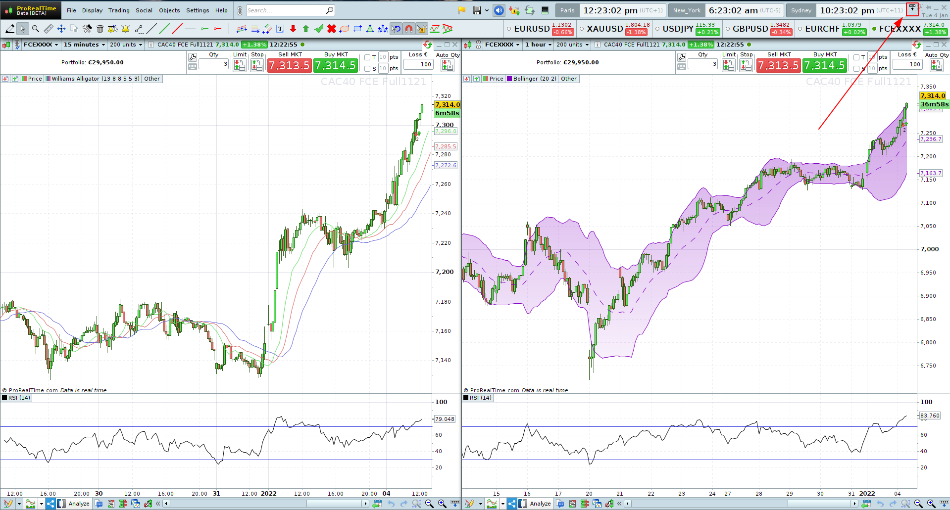 Display up to 6 time zones in the configuration of your choice directly from the main ProRealTime window in 12 hour mode or 24 hour mode, with or without seconds, with or without the timezone name (ex : UTC+2), with or without a city (ex : Paris).