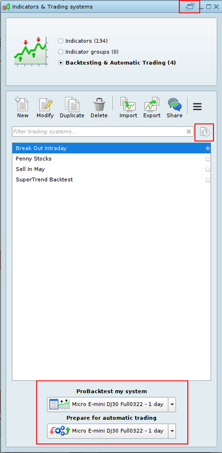 Additional access to the “Indicators & Trading Systems” popup from the Display menu will be available, as 2 new menu entries :”Indicators” & “ProBacktest”
