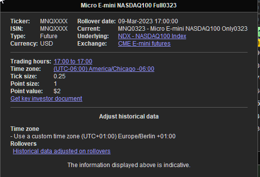* MNQ Micro-Mini NQ 2$/point Margin ~2000€ Cost 0.62$/contract