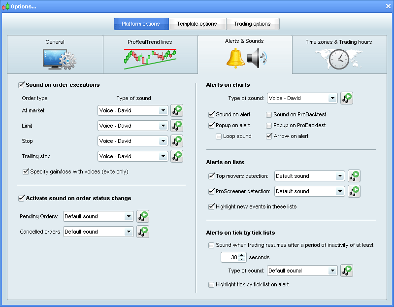 * Human voice available to announce order executions and alerts triggered (ex “Buy at market executed” ; “Alert triggered – sell”)