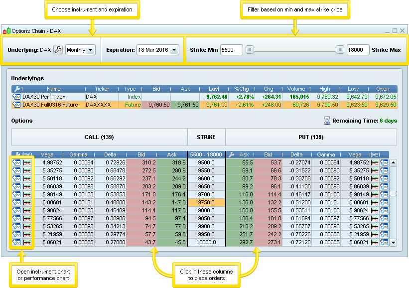 * You can choose an expiration date and filter by minimum and maximum strike price