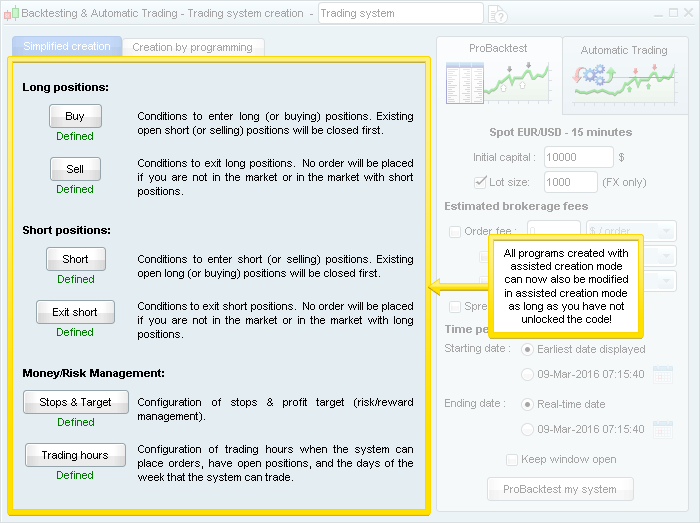 * You can now define days of the week and times of day the system can trade in assisted creation mode