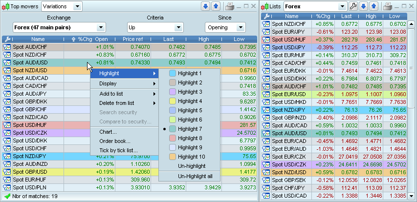 * Selected instruments are highlighted across all lists including orders, portfolios, screeners, top movers, etc