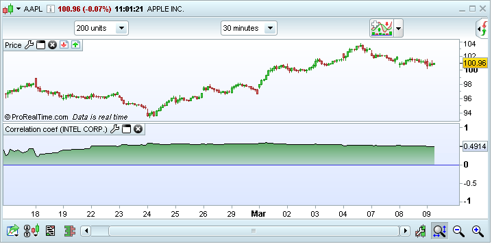 Correlation coefficient indicator – measures the correlation in price between 2 instruments. A correlation close to 1 shows a very strong correlation.