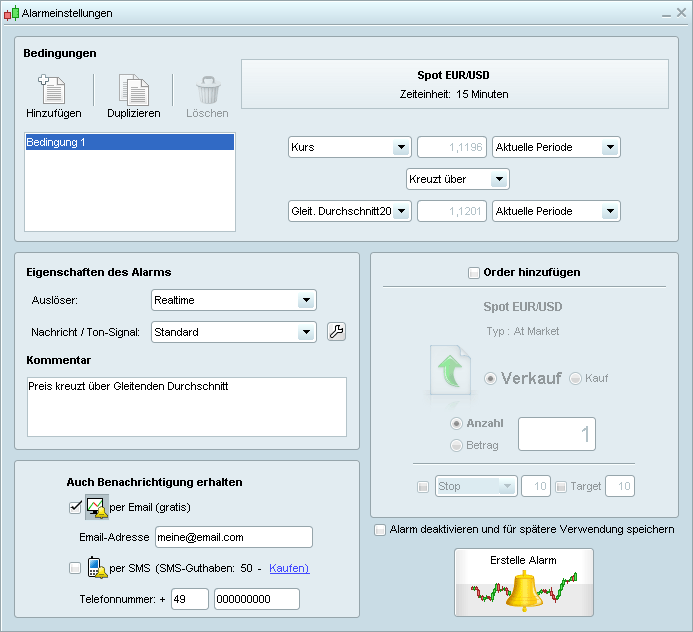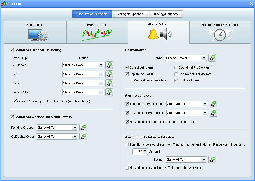 * Menschliche Stimme bei ausgelösten Ordern und Alarmen (z.B. “Kauf zum Marktpreis”; “Alarm ausgelöst – Verkauf”)