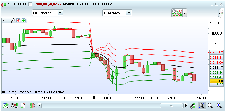 VWAP und VWAP Bänder – Der Volume Weighted Average Price-Indikator zeigt den durchschnittlichen Preis an, wobei dieser auf der Basis des Volumens über einen bestimmten Zeitraum gewichtet wird. Bei den VWAP-Bändern wird auf den VWAP eine Standardabweichung angewendet