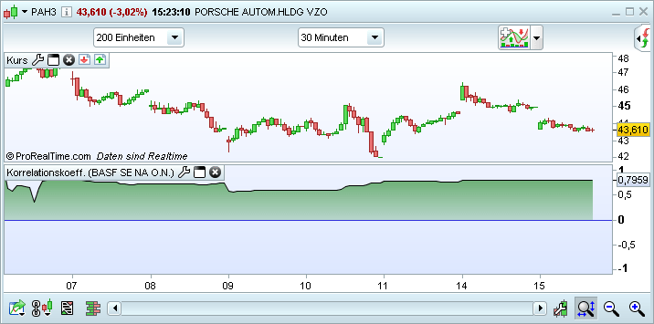 Korrelationskoeffizient-Indikator – Dieser Indikator misst die Korrelation zwischen zwei Instrumenten. Eine Korrelation um den Wert 1 bedeutet eine sehr hohe Korrelation.