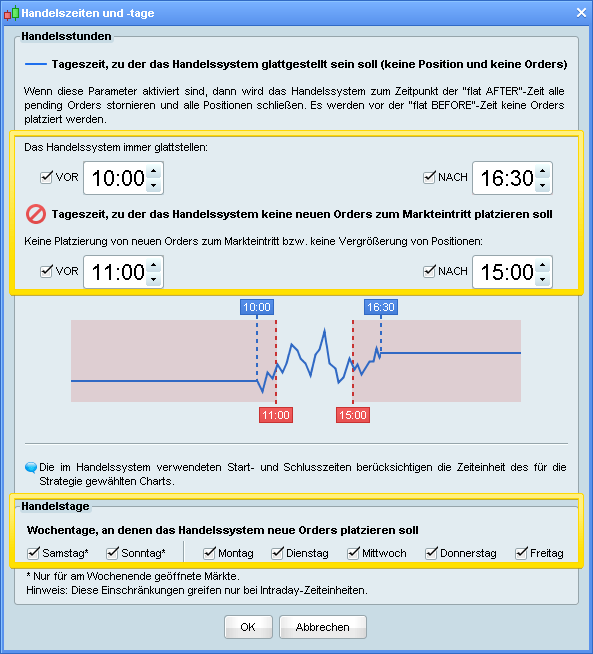 * Sie können jetzt über den Programmierassistenten Wochentage und Tageszeiten festlegen, zu denen das Handelssystem traden kann.