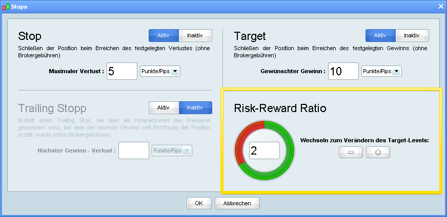 * Sie können hier weiterhin die Risk-Reward-Ratio festlegen und die Software wird Ihr Target entsprechend anpassen.