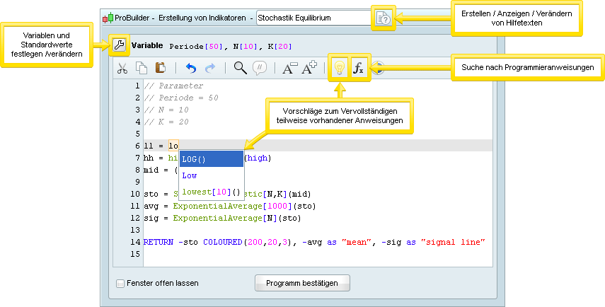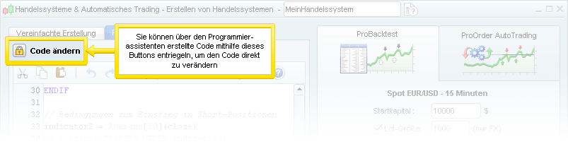 Nach dem Erstellen eines Handelssystems oder eines Marktscanners mithilfe des Programmierassistenten kann der Code jetzt auch nachträglich ohne Programmierung verändert werden.