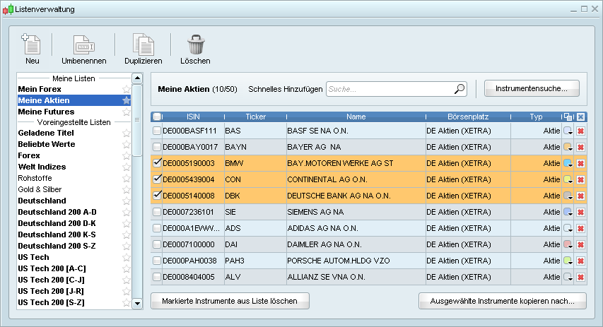 * Hinzufügen von Tick-by-Tick-Listen mittels Drag’n Drop von anderen Listen oder durch Klicken auf das Schraubenschlüssel-Symbol in der Kopfzeile; Löschen der Instrumente über ein Klicken auf das rote Kreuz.