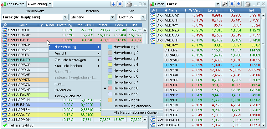 * Die Option zum Hervorheben von Instrumenten in Listen wurde verbessert. Sie können jetzt bis zu 10 unterschiedliche Farben gleichzeitig verwenden.