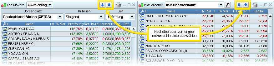 * Neue Pfeile zur Auswahl des vorherigen oder nächsten Instrumentes in Listen (einschließlich ProScreener und Top Movers).