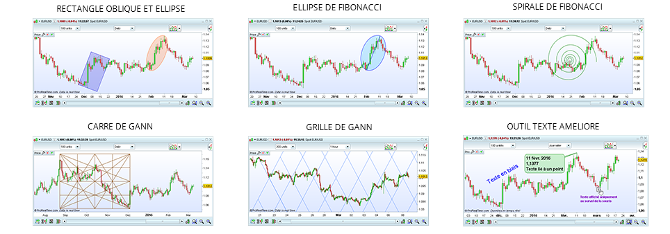 * Grille de Gann – Une grille de Gann est créée à partir de lignes parallèles formant une grille basée sur une ligne de tendance initiale.