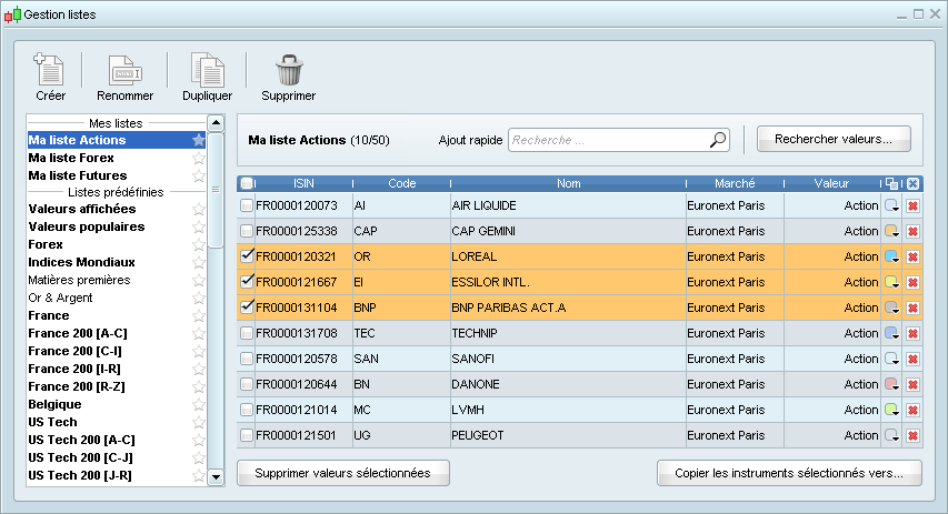 * Ajout d’instruments à la liste tick par tick avec un glisser/déposer d’autres listes ou en cliquant sur la “clé anglaise” dans la barre de titre ; cliquez sur la croix rouge dans la barre de titre pour supprimer des instrumens