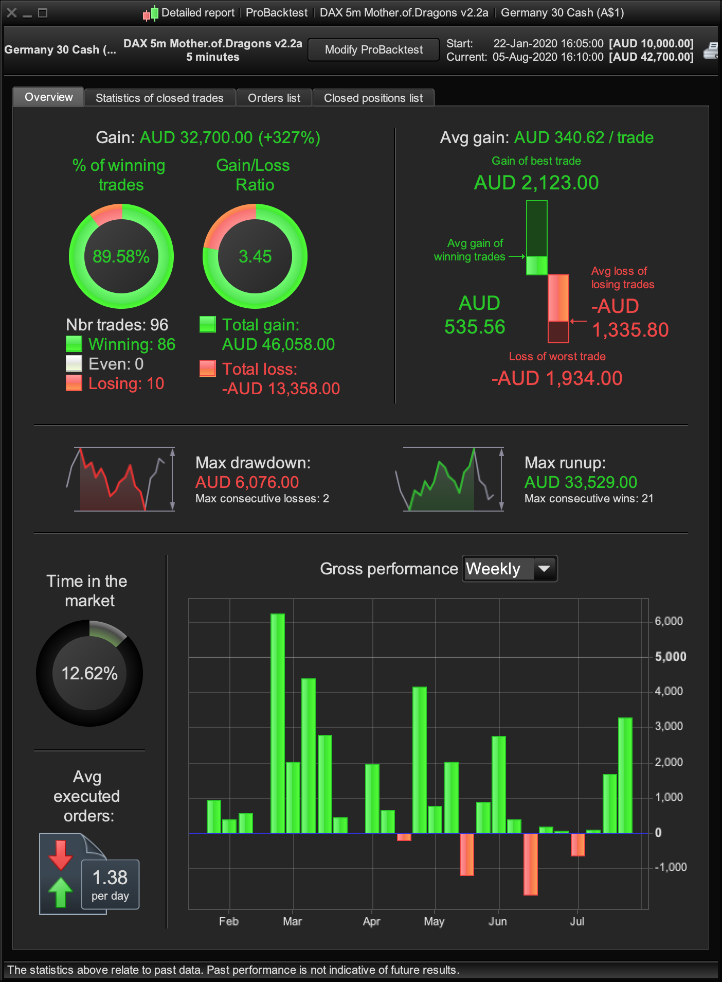 - It’s important to assess the results on a weekly basis, too many algo providers are supplying monthly views and I find it a little misleading. The reason behind this is that if you are having multiple weeks of big losses in just a couple of months it will significantly impact your trust and phycology when keeping it running.