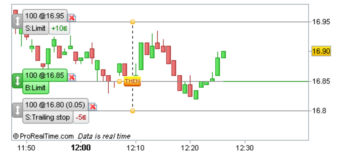 Example: We create a strategy composed of a primary order at a limit price of 16.85€, a target Limit order at 16.95€ and a protection Trailing Stop at 16.80€. If the main order is triggered, the two subordinate orders are set.