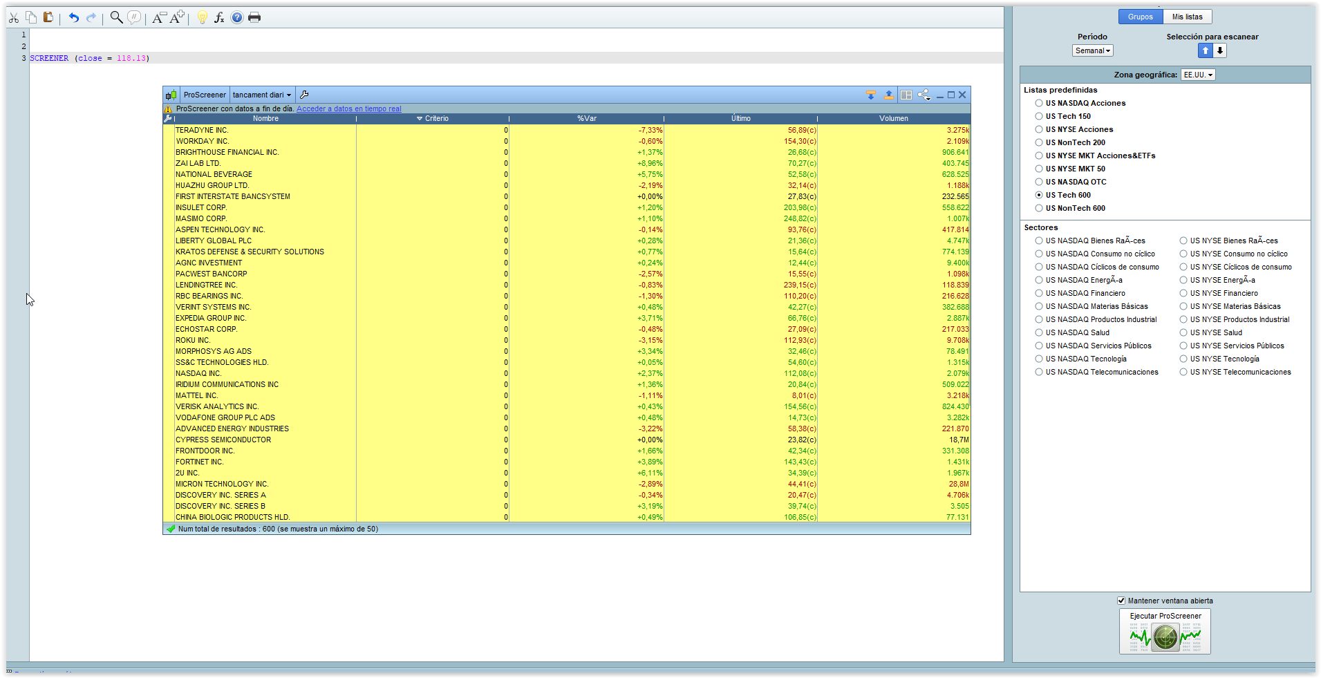Hola, tengo un sistemita de inversión semanal, en muchos activos recibo los datos diferidos en 15 minutos y otros a fin de dia. El problema es que cuando los viernes, una vez cierra el mercado, paso el screener, me salen los mismos valores que el lunes, y no es hasta el lunes siguiente, cuando carga los valores de la semana anterior. Esto me dificulta poner las ordenes el viernes y tengo que esperar a que el mercado esté abierto con sus movimientos para ponerlas.