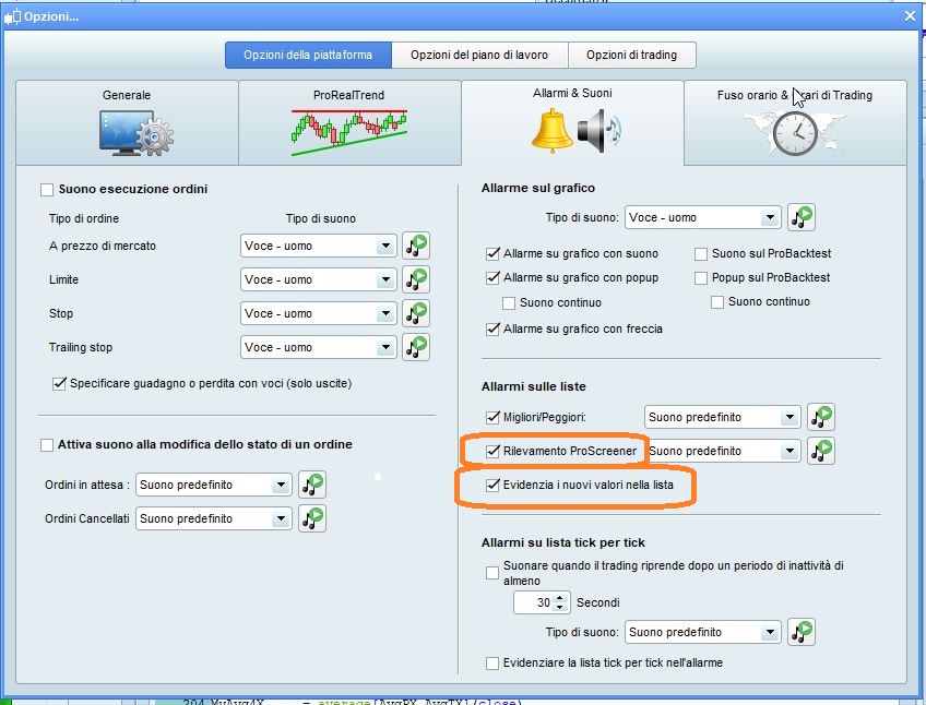 ProScreener emette automaticamente un suono quando rileva un nuovo strumento, se è settata l’opzione (vedi foto).