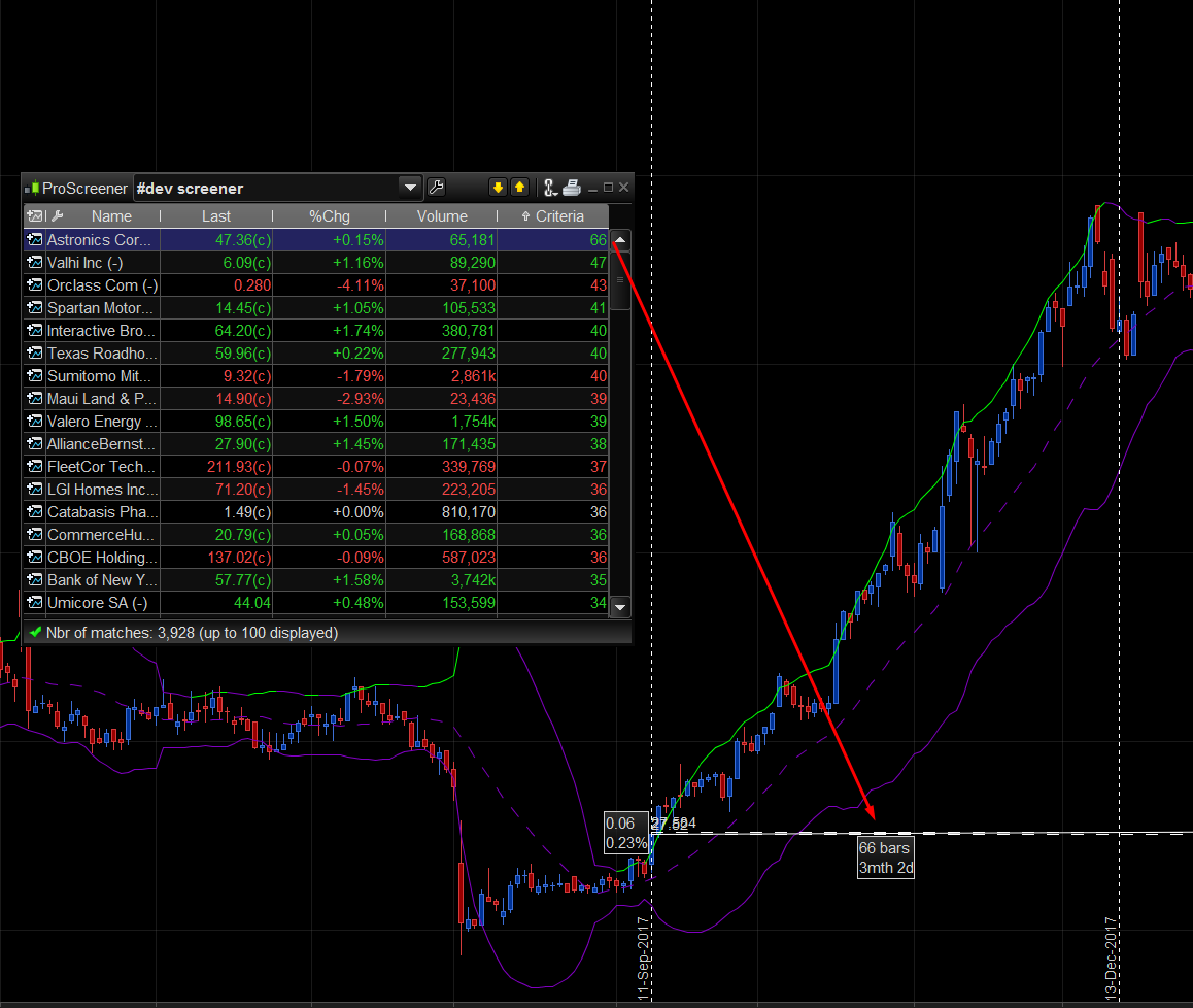 Dans la colonne de tri, tu retrouveras le nombre de bars qu’a duré la dernière occurrence de la condition complète, soit depuis le breakout de la bollinger supérieure jusqu’à sa déclinaison, comme dans l’exemple ci-joint.