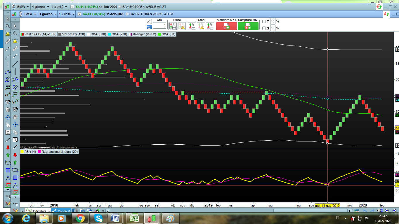 Roberto come ultimo codice chiedevo se e quando possibile nei prossimi giorni, l estrazione dei titoli che mostrano una candela Renko (estratta con l ATR 14 periodi) su grafici sempre giornalieri come le precedenti richieste, verde e un rsi a 14 sotto 35 per il long oppure una candela Renko rossa e un RSI sopra 65 per lo short. Allego esempio del titolo BMW il 09/09/2019. Grazie mille, buoan serata.