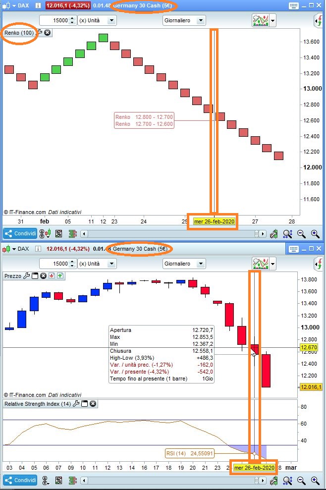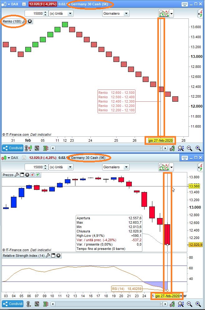 Vedi dalle mie due foto allegate la differenza tra il cursore sulla candela giornaliera di Mercoledì e su quella di Giovedì, che in ordine di tempo sono accanto, mentre la stessa linea del cursore, sul grafico Renko a 100 punti è sfalzato, i mattoncini non sono accanto, ce ne sono altri nel mezzo.