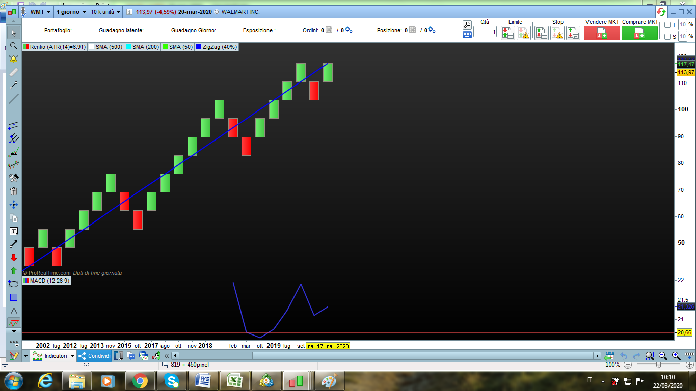 Buon giorno Roberto, ho provato a cambiare il box del Renko inserendo l ATR a 14 periodi (cioè il box deve essere grande come il valore ATR del titolo) , ho tolto lo Zig Zag e per il long ho provato a riscrivere tuo codice come sotto, ma non mi trova nulla su nessun mercato, pur essendoci titoli com Walmart che ti allego che con l ultimo close hanno avuto il box verde Renko, puoi correggermelo? e nel caso indicarmi per lo Short come fare, grazie mille.