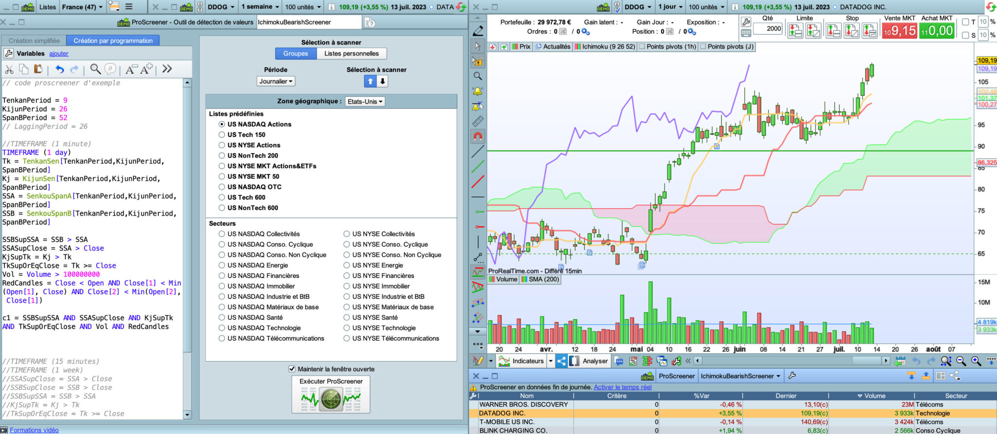 L’exécution de ce screener sur la liste « US Nasdaq Actions » me renvoie des résultats comme DATADOG (DDOG).