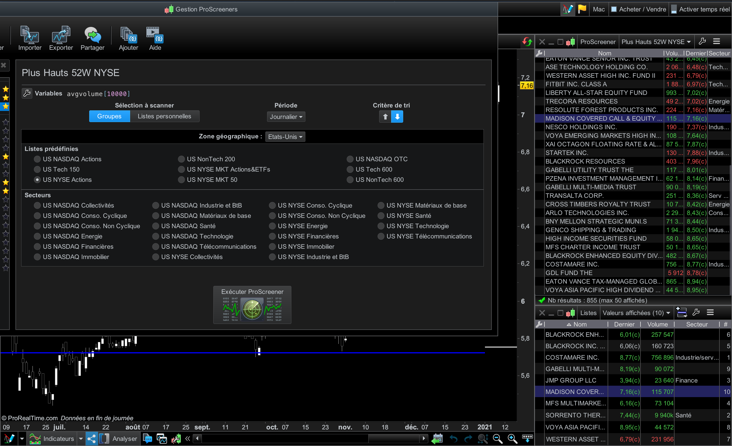 J’ai lancé un ProScreener sur la liste “US NYSE Actions” mais je me retrouve avec beaucoup, beaucoup de fonds affichés et donc assez peu d’actions (cf. le screen ci-dessous)