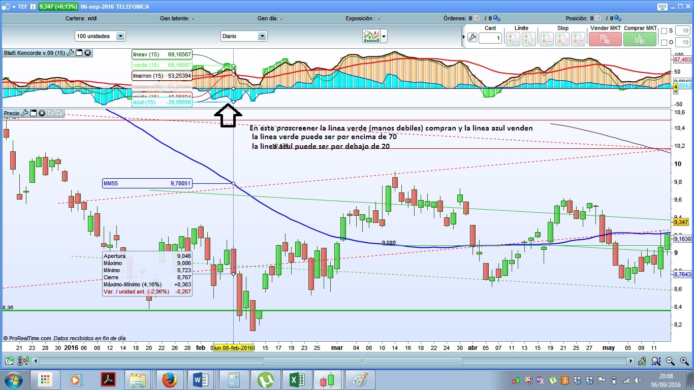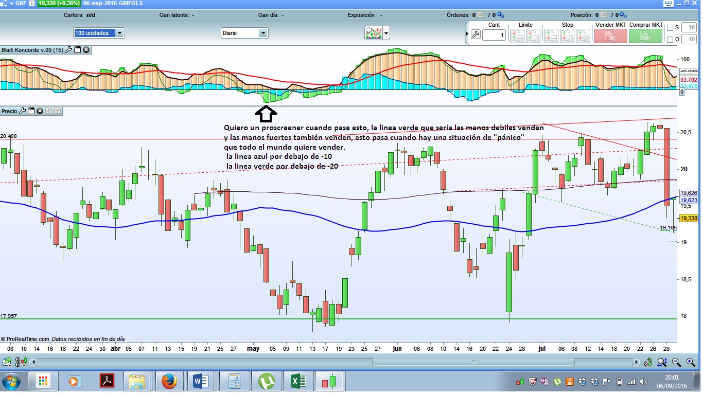 Y el tercero que buscas, pánico vendedor pero que las manos débiles y fuertes compren, tienes que definir los parámetros mas, es decir que puedes decir que la linea roja este por encima de la marron y la verde, pero que la verde por encima de la marrón y la azul mayor que 0, lo que pasa que deberias defininir valores, tambien lo puedes hacer con momentum, pero hay que tener claro los valores que quieres definir.