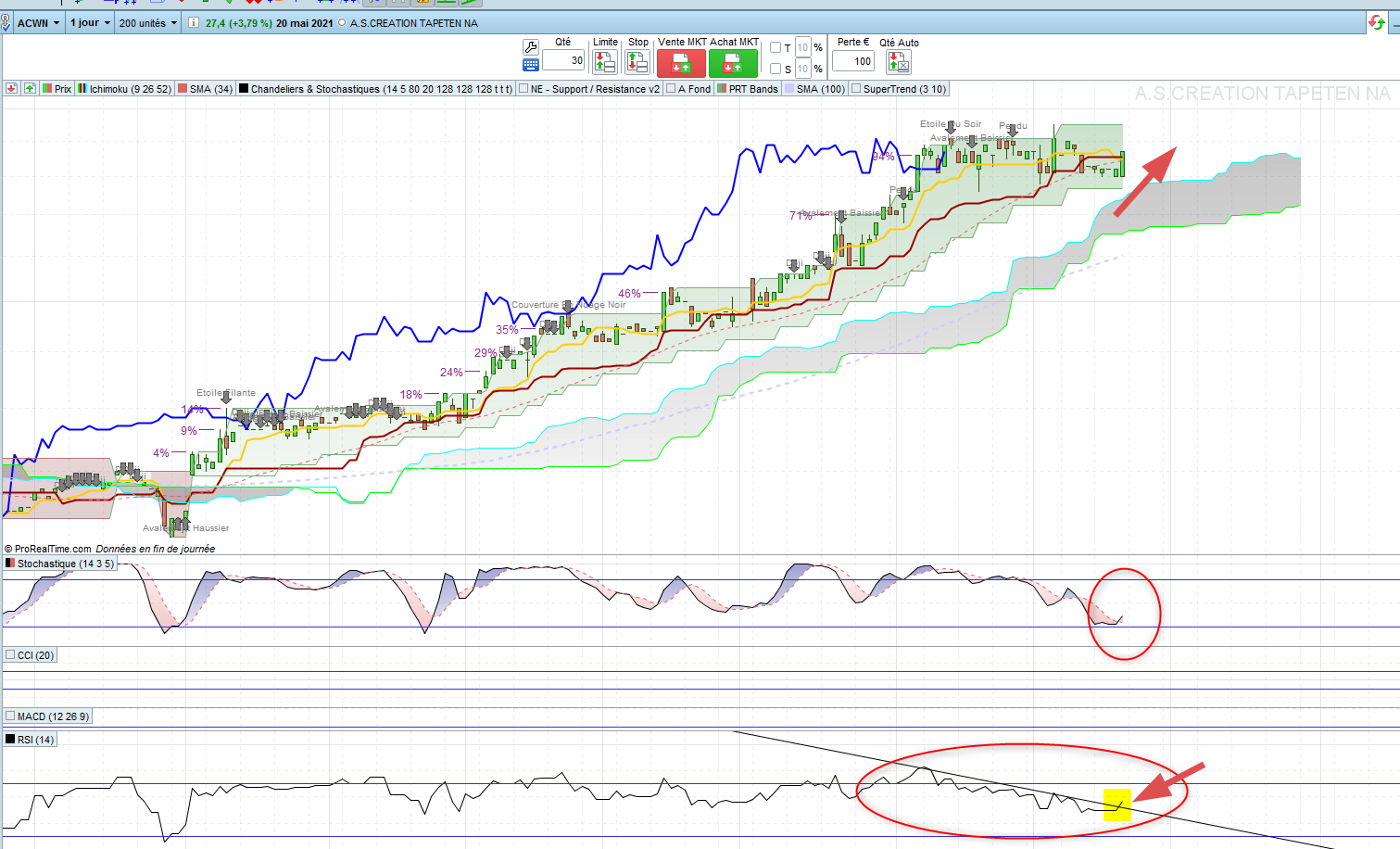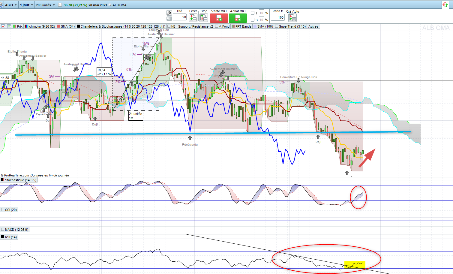- Le RSI a cassé cette droite de tendance baissière au cours des 2 dernières séances.