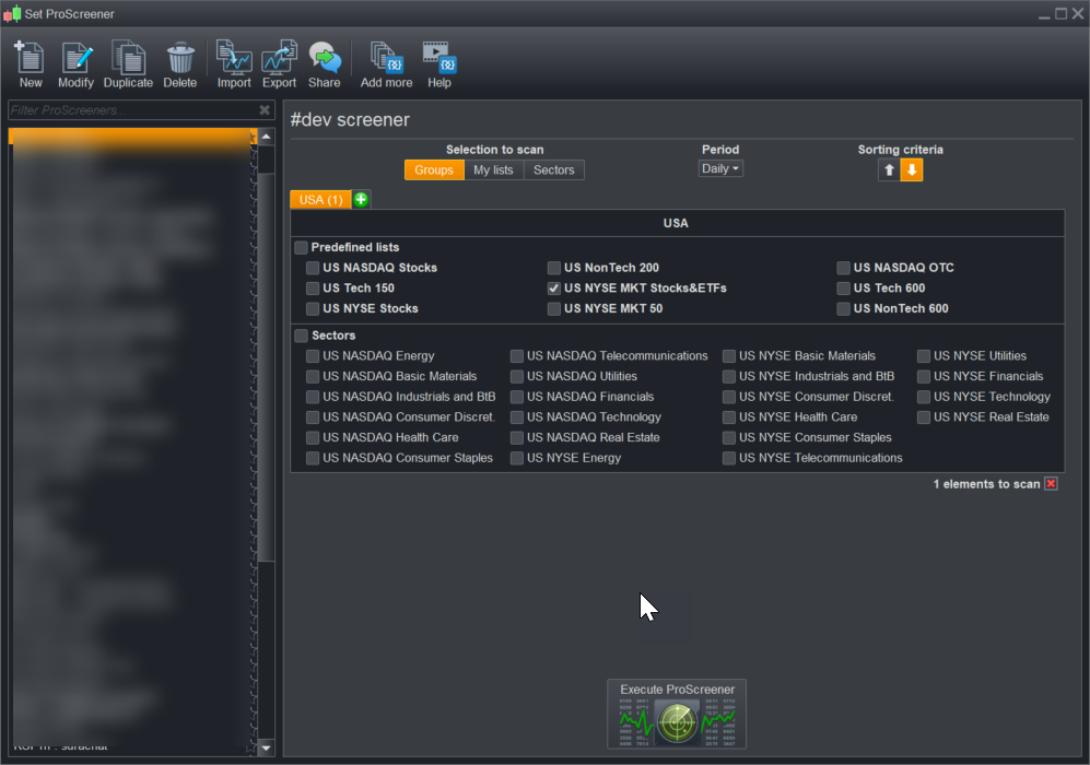 En version 11 toutefois, les critères de recherche de ProScreener sont plus détaillés et on peut par exemple scanner uniquement certains secteurs dans certaines sous-catégories et par pays (voir image).
