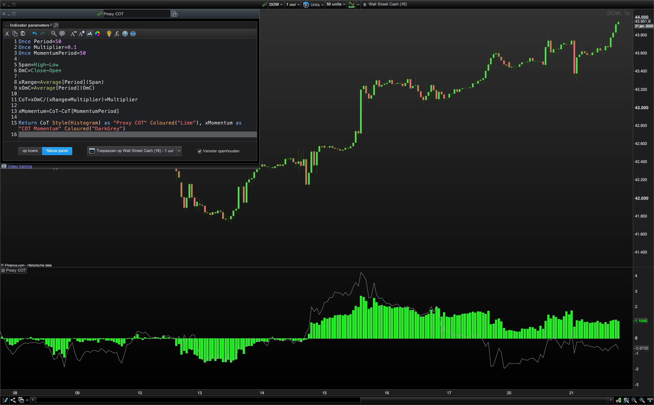Return CoT Style(Histogram) as "Proxy COT" Coloured("Lime"), xMomentum as "COT Momentum" Coloured("DarkGrey")