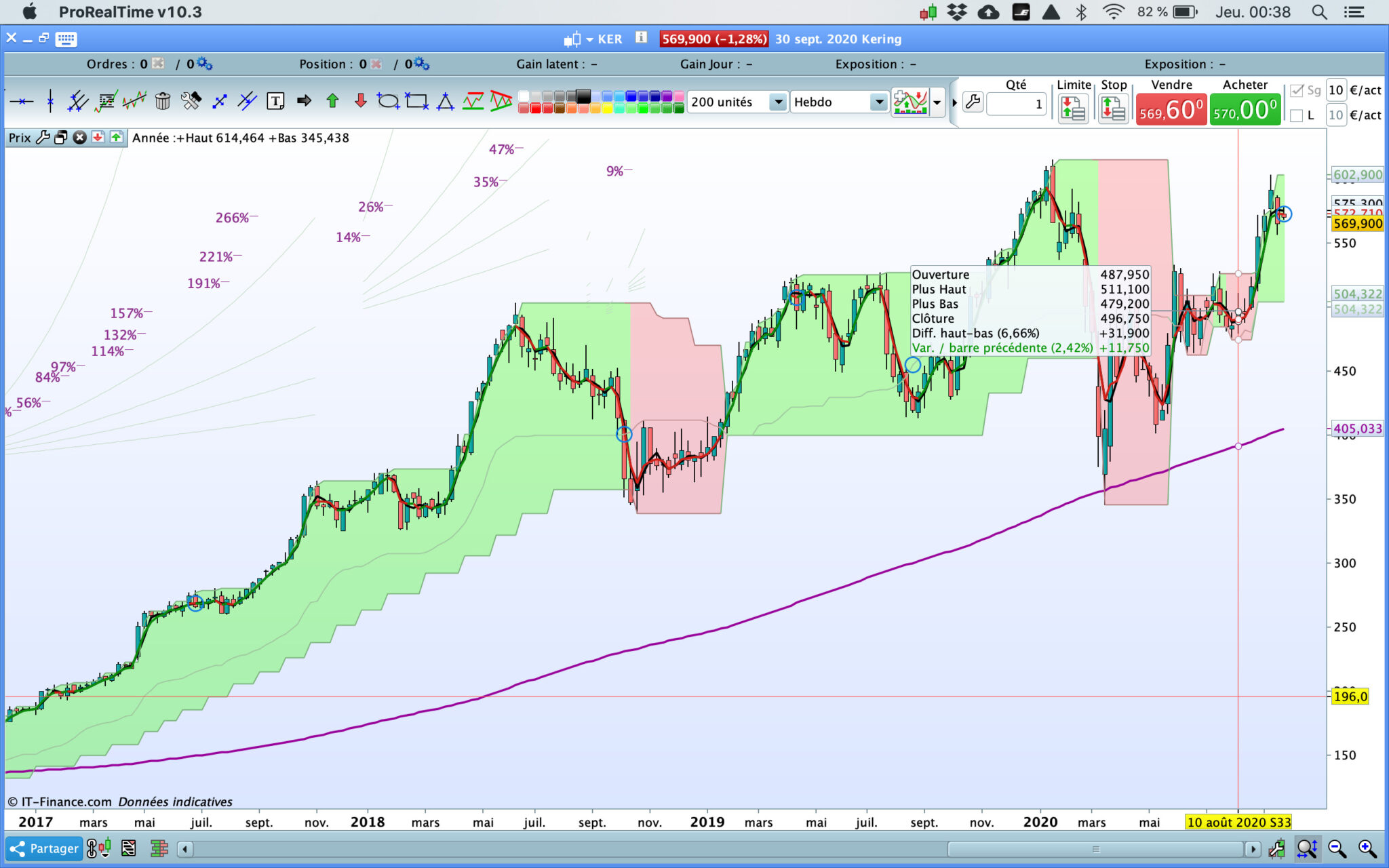 IG utilise toujours la version 10.3 du logiciel. Lorsque j’utilise l’indicateur PRT Bands sur cette version, j’ai le même bug d’affichage que celui que j’avais au début sur la 11.1 dans mon message cité ci-dessus (lignes de vitesse et pourcentages décalés sur le graph). Je mets une copie d’écran ci-dessous.