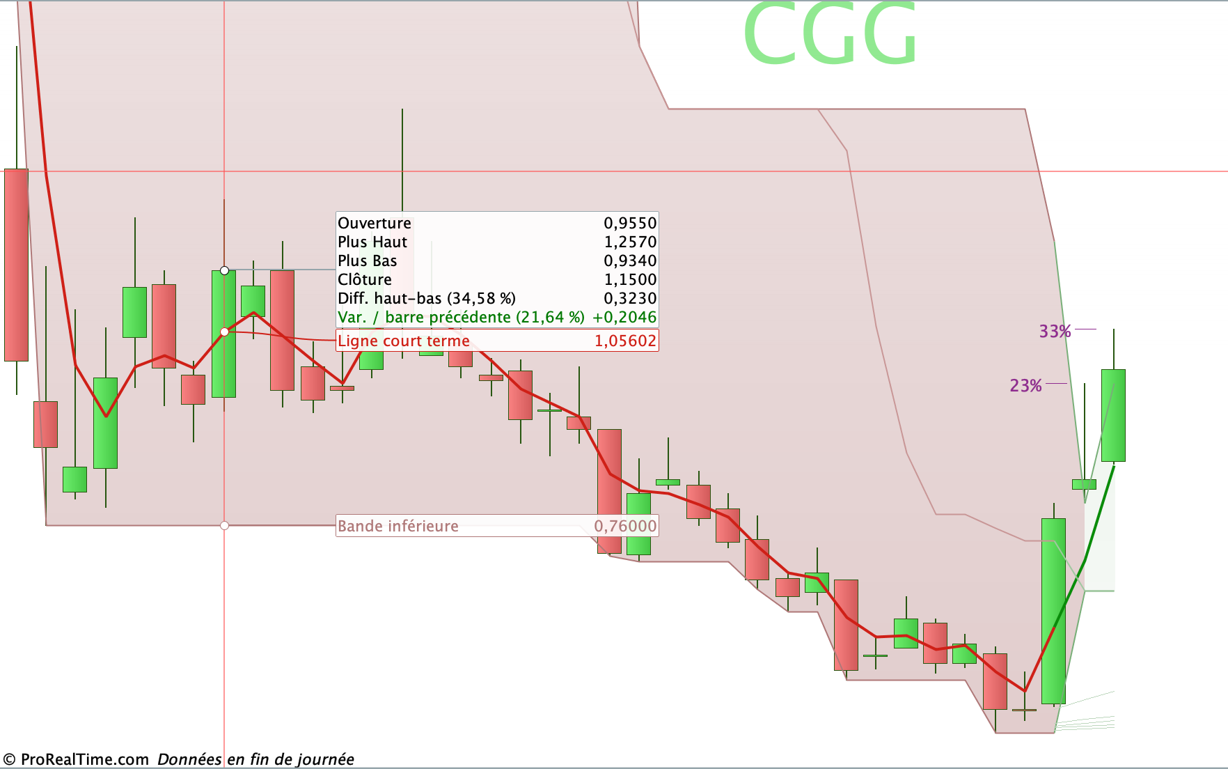 – si la tendance générale déterminée sur la base de PRTBandsUp et PRTBandsDown est haussière, alors PRTBandsShortTerm est rouge ou verte suivant qu’elle est haussière ou baissière.